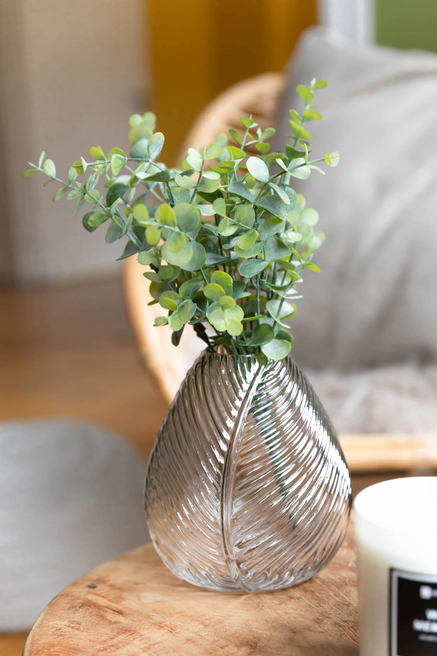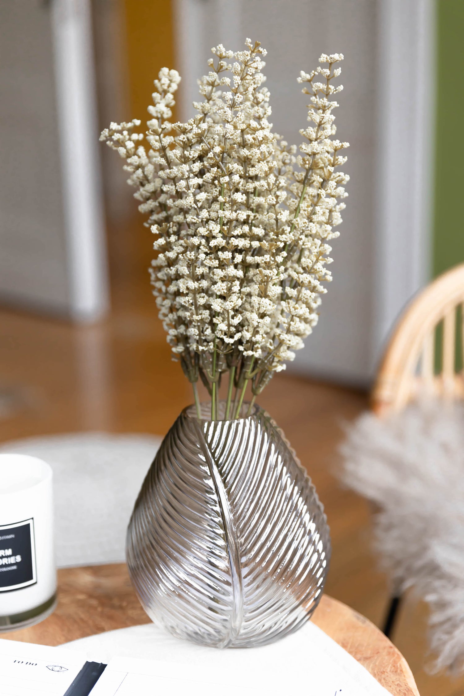 Vasen kann man nie genug haben! Die Form dieser Vase aus Glas sieht aus wie ein Blatt und bringt deine Blumen noch mehr zum Strahlen. Die Vase eignet sich zum Beispiel perfekt für Trockenblumen.