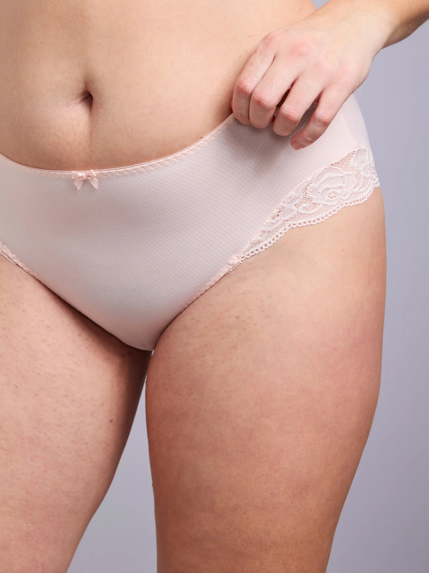 Unser Bestseller Florence mit einem neuen Spitzenrand. Gleiche tolle Passform, in einem trendigen neuen Look. Das Tai hat eine bequeme und elastische Passform, einen hohen Beinausschnitt und einen Stoff, der den größten Teil des Pos bedeckt. Die schönen Spitzendetails verleihen dem Höschen einen femininen Touch. Die Tai Panty ist sowohl für kleine als auch für große Größen geeignet.