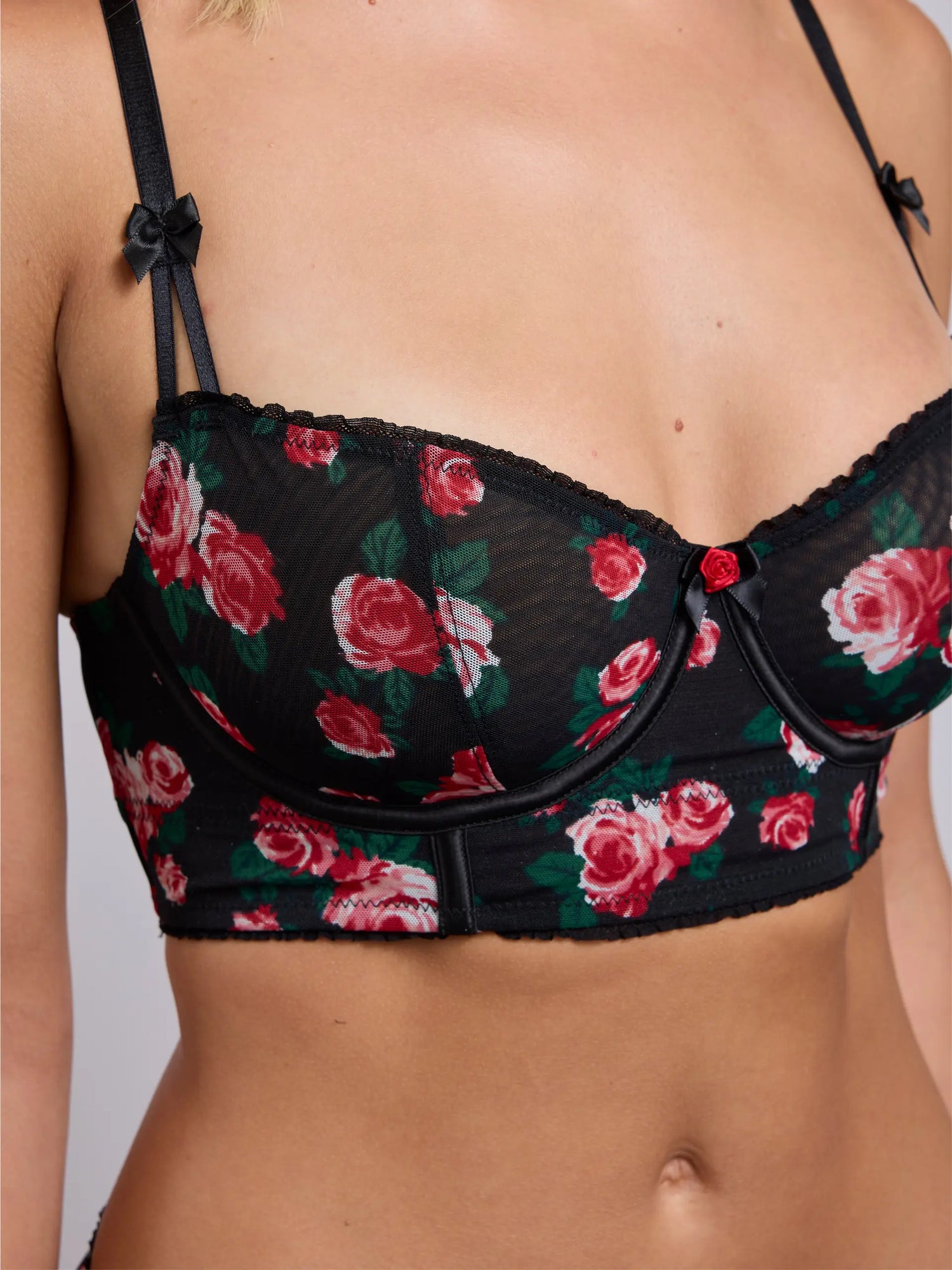 Vintage-Romantik trifft moderne Struktur. Der Laurel Balconette Longline bietet eine schmeichelhafte, anhebende Form mit kräftigem Rosenprint und zarten Details. Mit unterlegten Cups, stützenden Nähten und Longline-Schnitt ist er zugleich Lingerie und Statement-Piece.