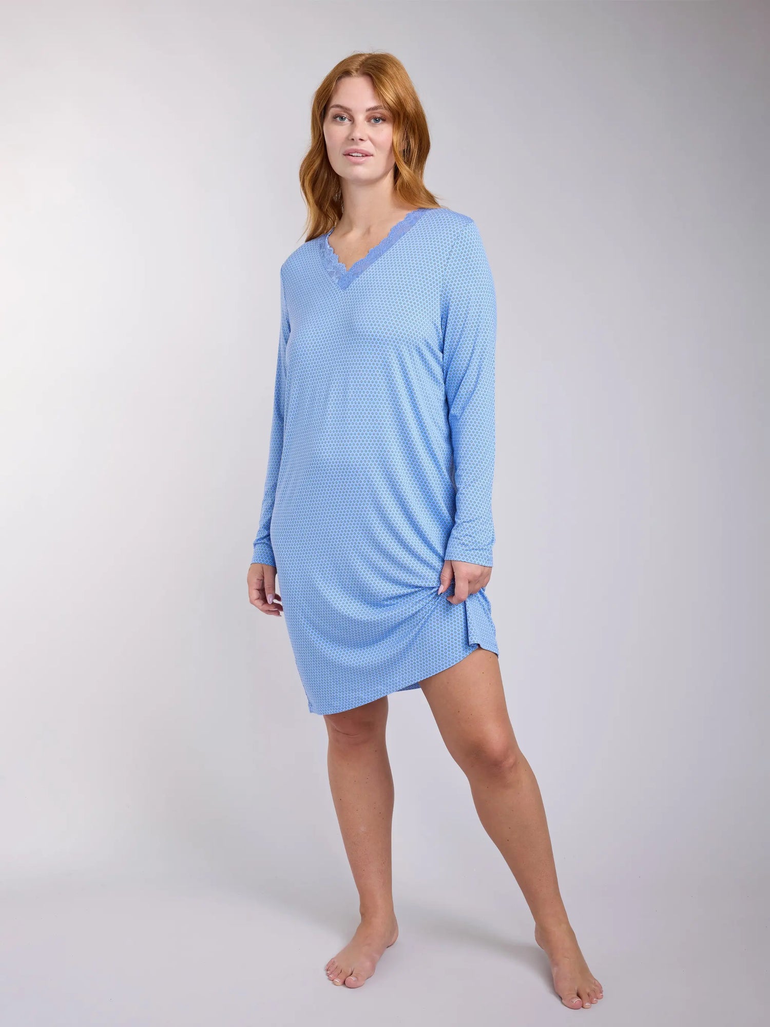 Die weichste Art, den Tag zu beenden. Das Lily Long Sleeve Dress hat einen schmeichelhaften V-Ausschnitt mit Spitzenbesatz, sanfte lange Ärmel und eine gerade geschnittene Silhouette, die den Körper umspielt, aber locker bleibt.