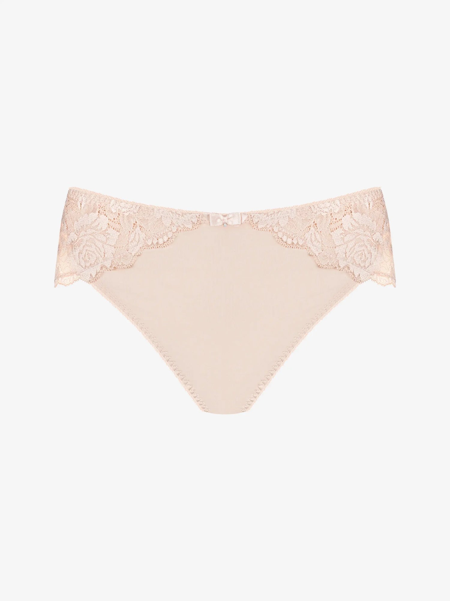 Schönes und romantisches Tai-Höschen mit normaler Leibhöhe. Die Spitze ist komplett flach, so dass sie unter der Kleidung kaum sichtbar ist.