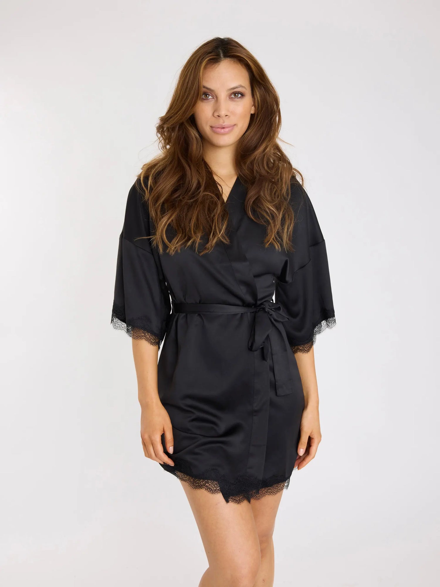 Der glamouröse Sadie Kimono sieht nicht nur schön aus, sondern fühlt sich auch seidig weich an. Die Passform ist locker und bequem, und der Kimono hat weite Ärmel mit einzigartigen Spitzendetails an den Rändern. Verwenden Sie das Band, um den Kimono eng an Ihren Körper zu schmiegen.