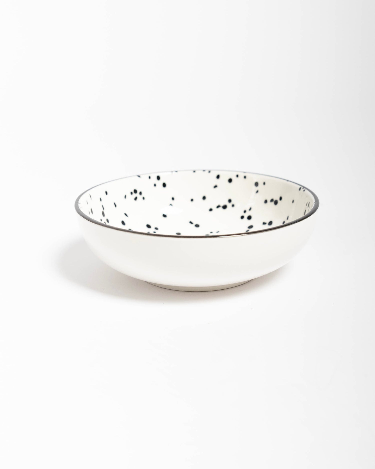 Langweiliges Geschirr ist ein No Go! Mit dieser trendy schwarz-weißen Geschirrkollektion kannst du den Tisch stilvoll decken. Denn wie cool ist dieses Design mit Dots? Perfekt für dein Lieblingsfrühstück, zum Beispiel deine tägliche Smoothiebowl! Mix & Match verschiedener Schüsseln, Teller und Tassen mit unterschiedlichen Mustern für ein schickes und modernes Tischbild.