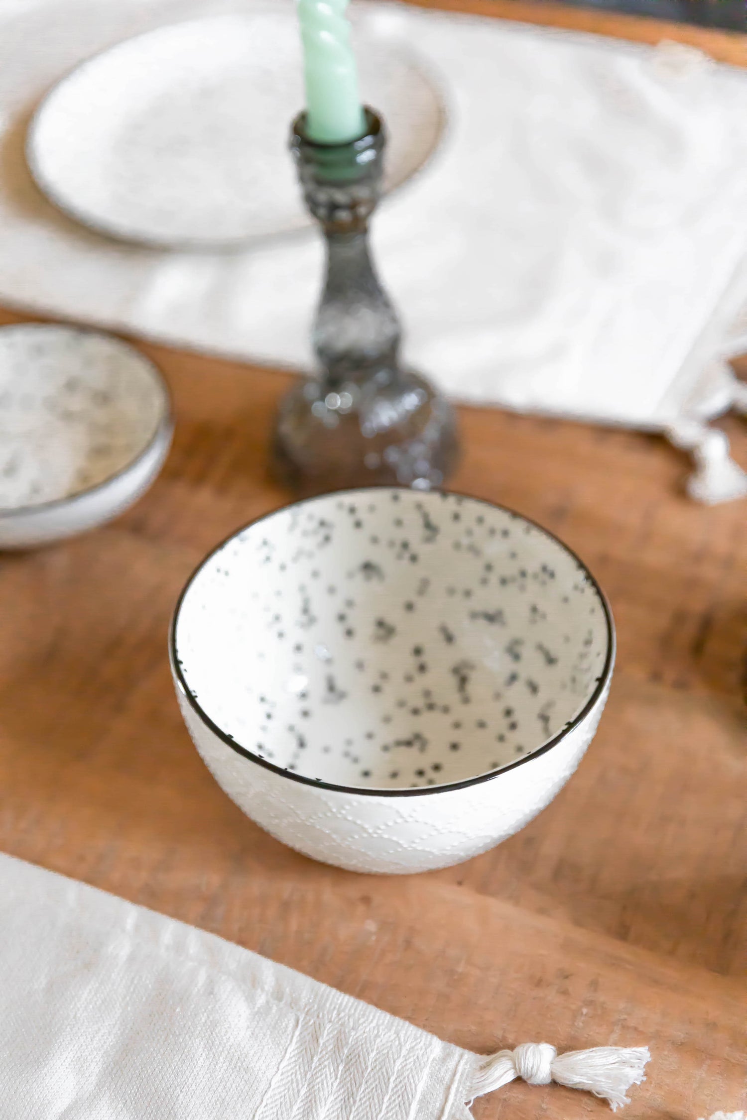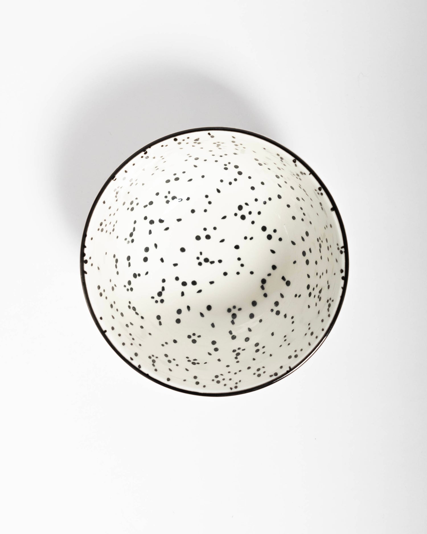 Langweiliges Geschirr ist ein No Go! Mit dieser trendy schwarz-weißen Geschirrkollektion kannst du den Tisch stilvoll decken. Denn wie cool ist dieses Design mit Dots? Perfekt für dein Lieblingsfrühstück, zum Beispiel deine tägliche Smoothiebowl! Mix & Match verschiedener Schüsseln, Teller und Tassen mit unterschiedlichen Mustern für ein schickes und modernes Tischbild.