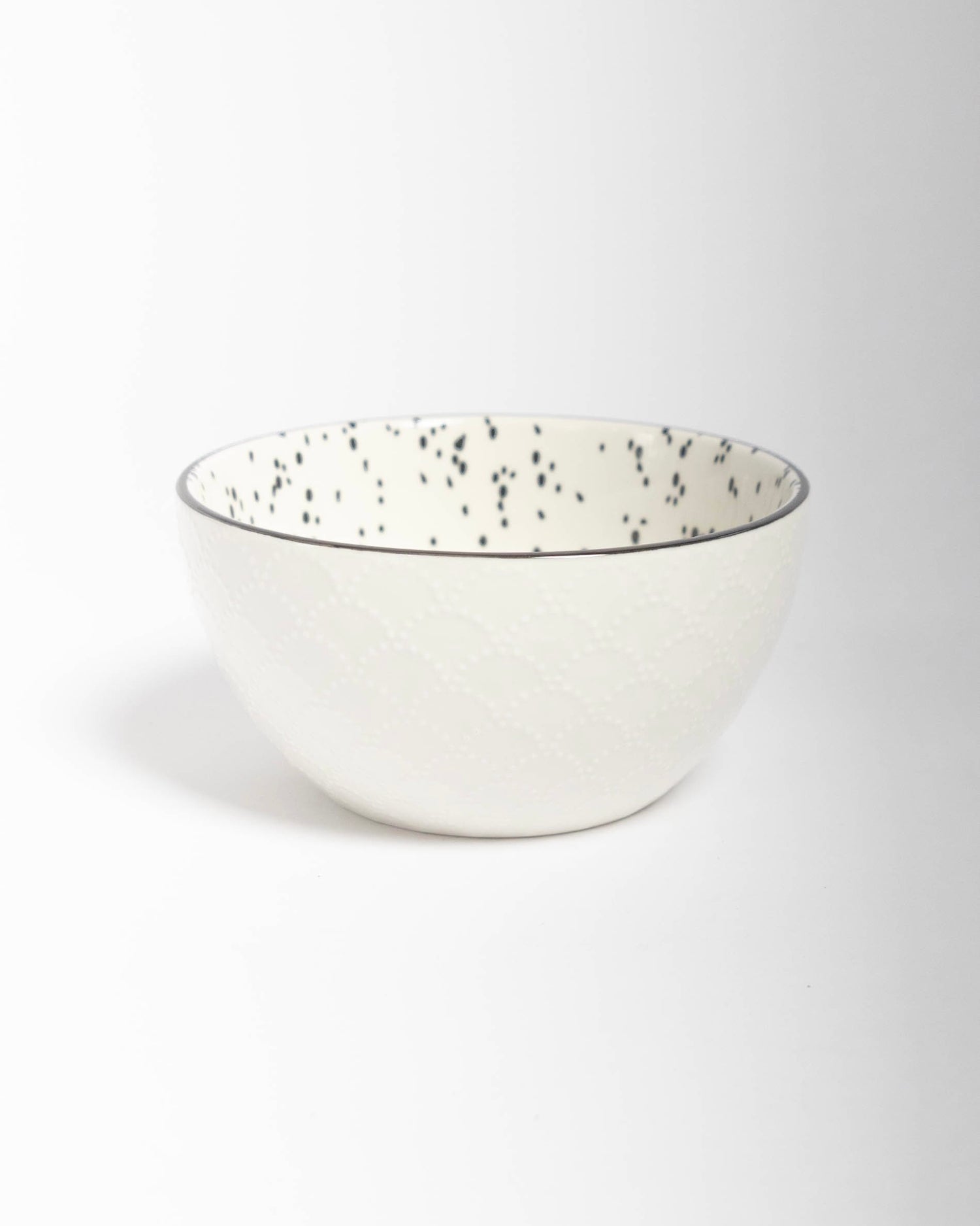 Diese Schüssel mit Dots hat eine Größe von Ø 15 cm und ist aus Porzellan gefertigt.