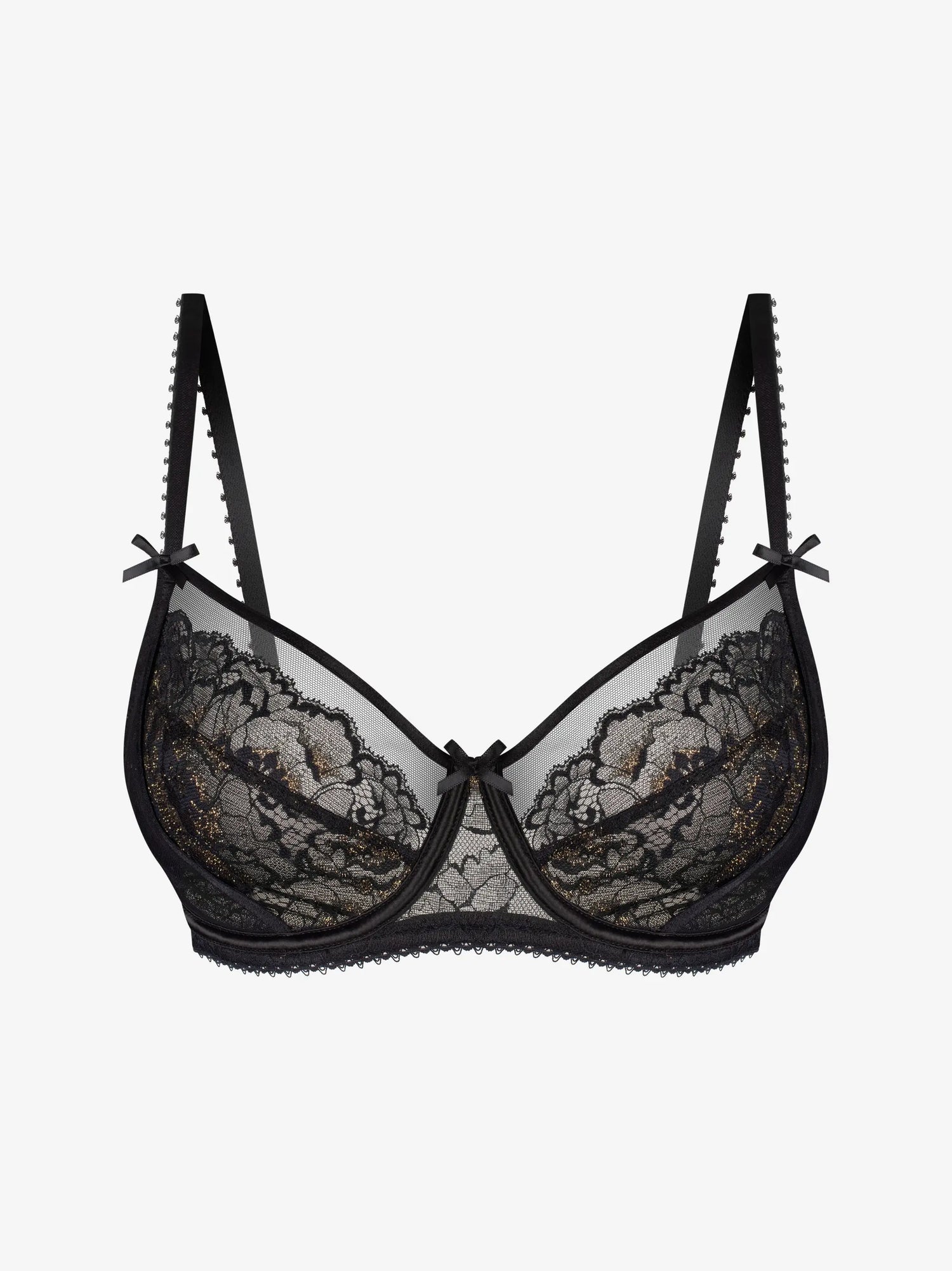 Wo Schimmer auf Halt trifft: Der Stella Full Cup umschmeichelt deine Kurven mit Goldfaden-Spitze und Full-Coverage Passform, die hebt und stützt. So sicher wie er auffällt – glamourös im Alltag neu definiert.