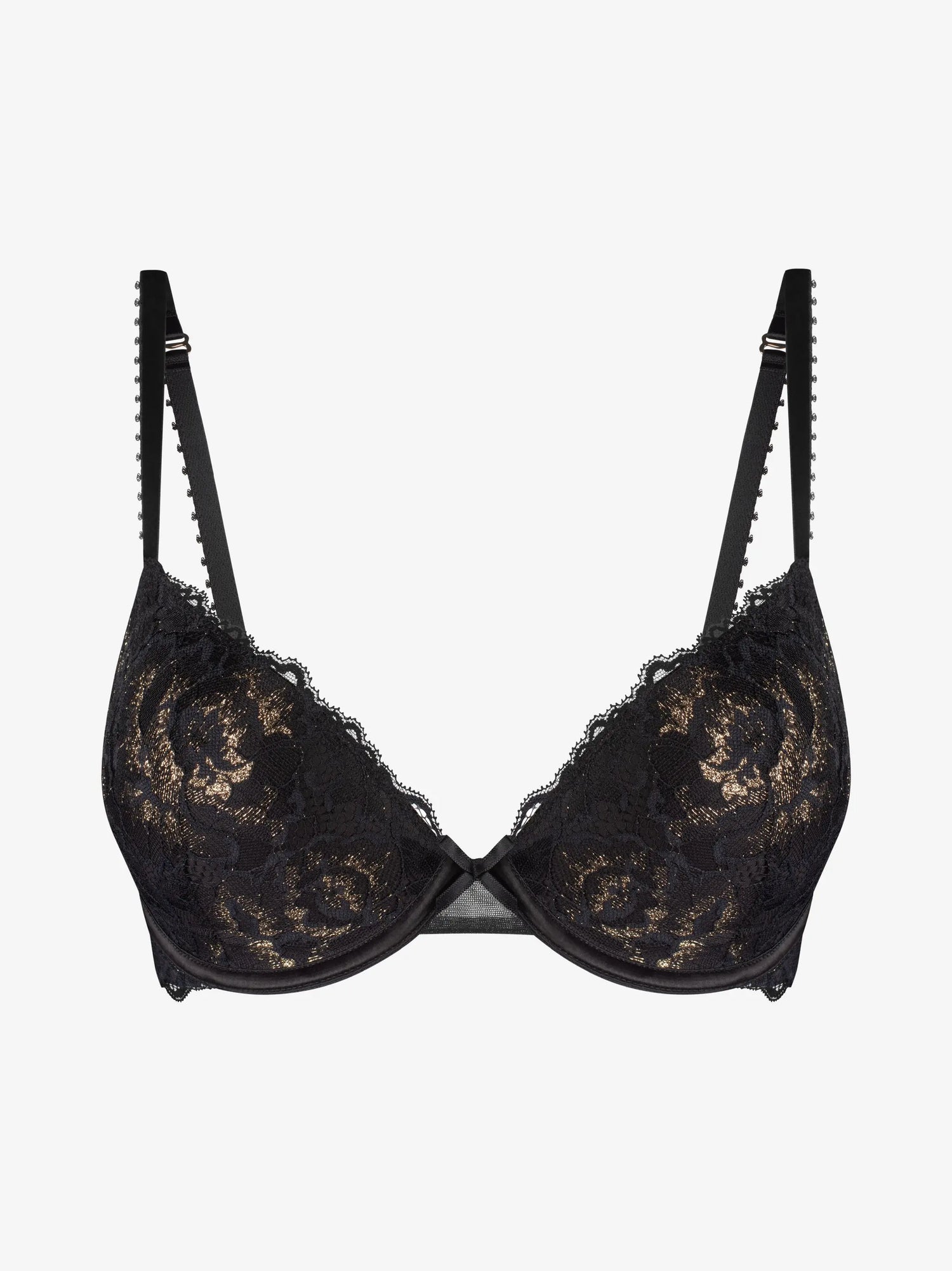 Form trifft Schimmer: Der Stella Push-Up formt, hebt und schafft mühelos eine volle Silhouette. Gepolsterte Cups, tiefes Dekolleté und glatte Multiway-Träger verbinden kraftvolle Formgebung mit schimmernder Goldspitze für einen strahlenden Look.