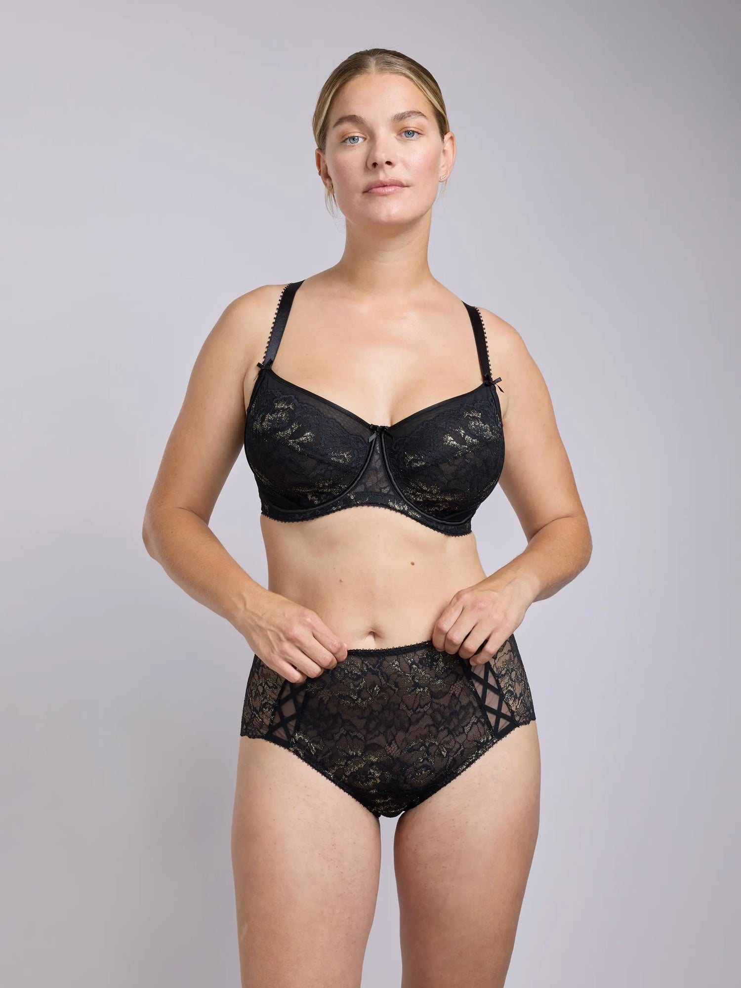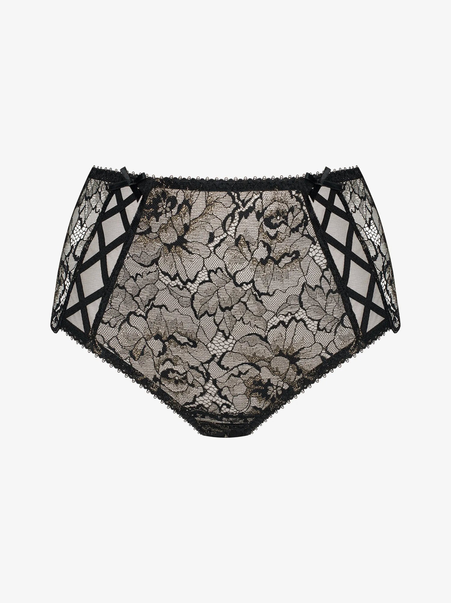 Vintage-Feeling mit modernem Schimmer. Der Stella Tai High Waist umschmeichelt die Taille selbstbewusst und bequem, gefertigt aus weicher Stretch-Spitze und veredelt mit goldenem Glanz.